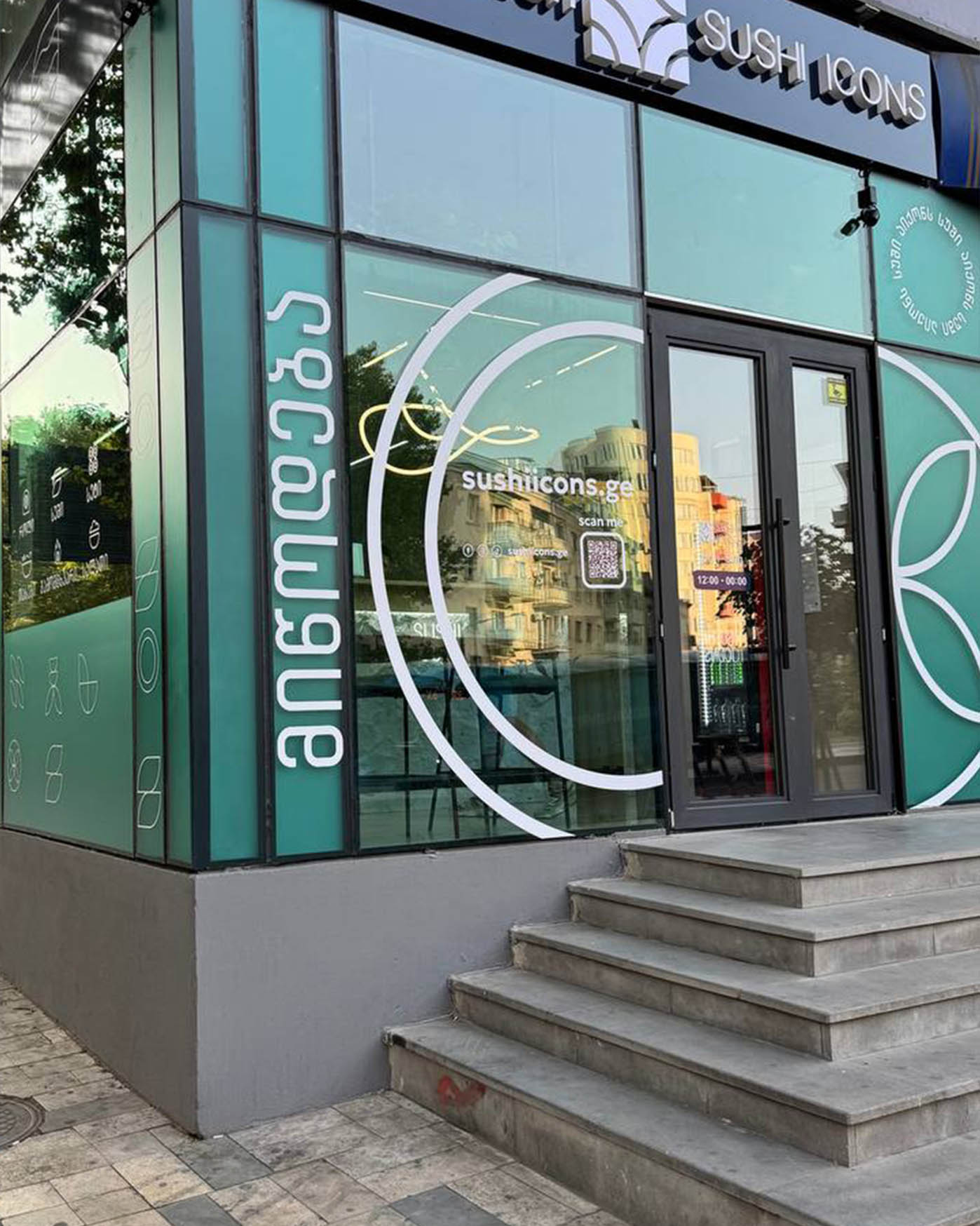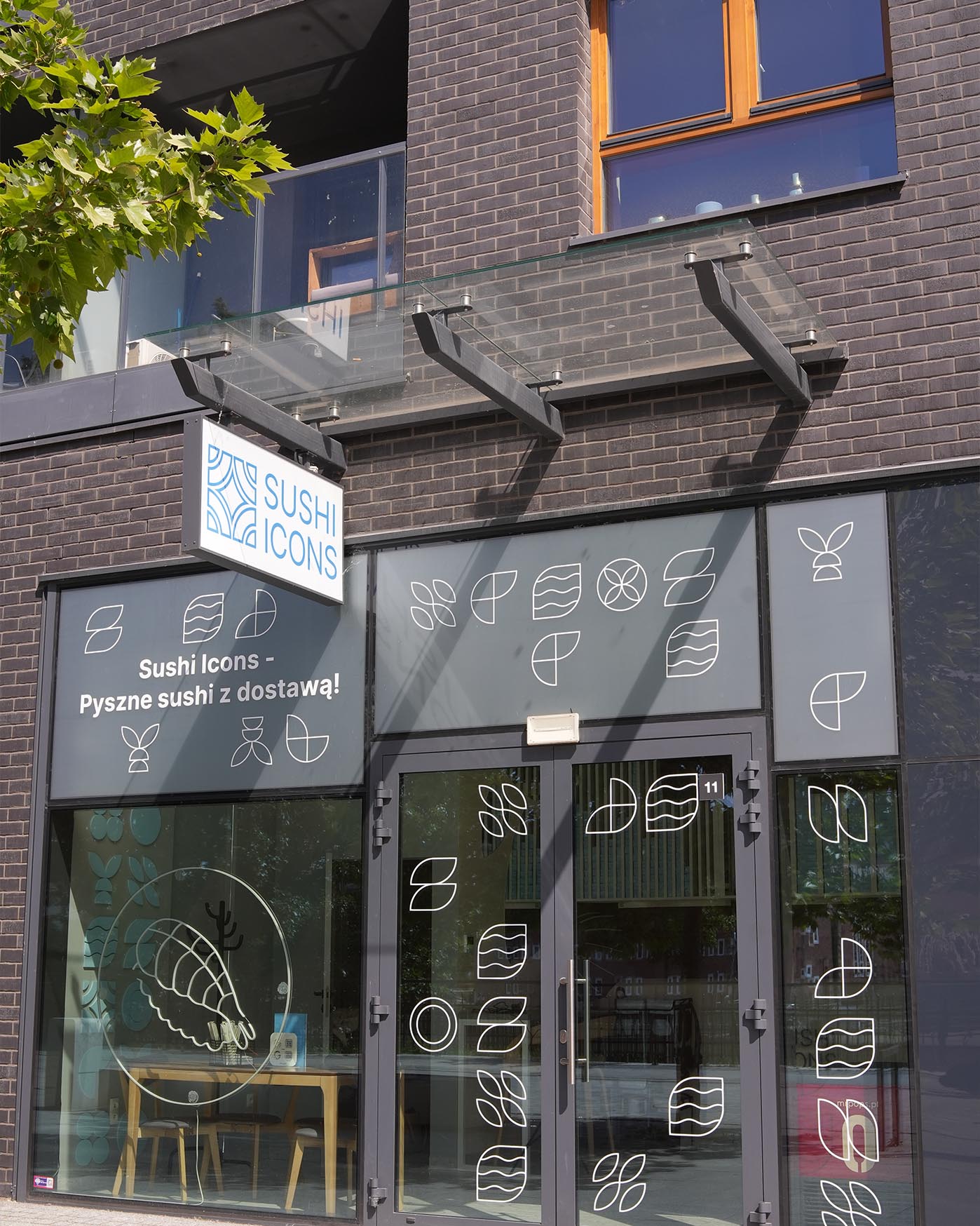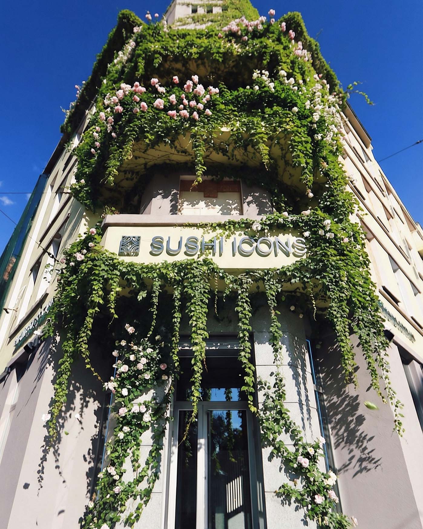 We started with the real architecture of the spot. The facade, windows, rhythm of the building, and Sushi Icons branding already carried a clean urban mood. Our goal was not to cover it with decoration but to highlight its structure and give the place a fresh, seasonal layer.