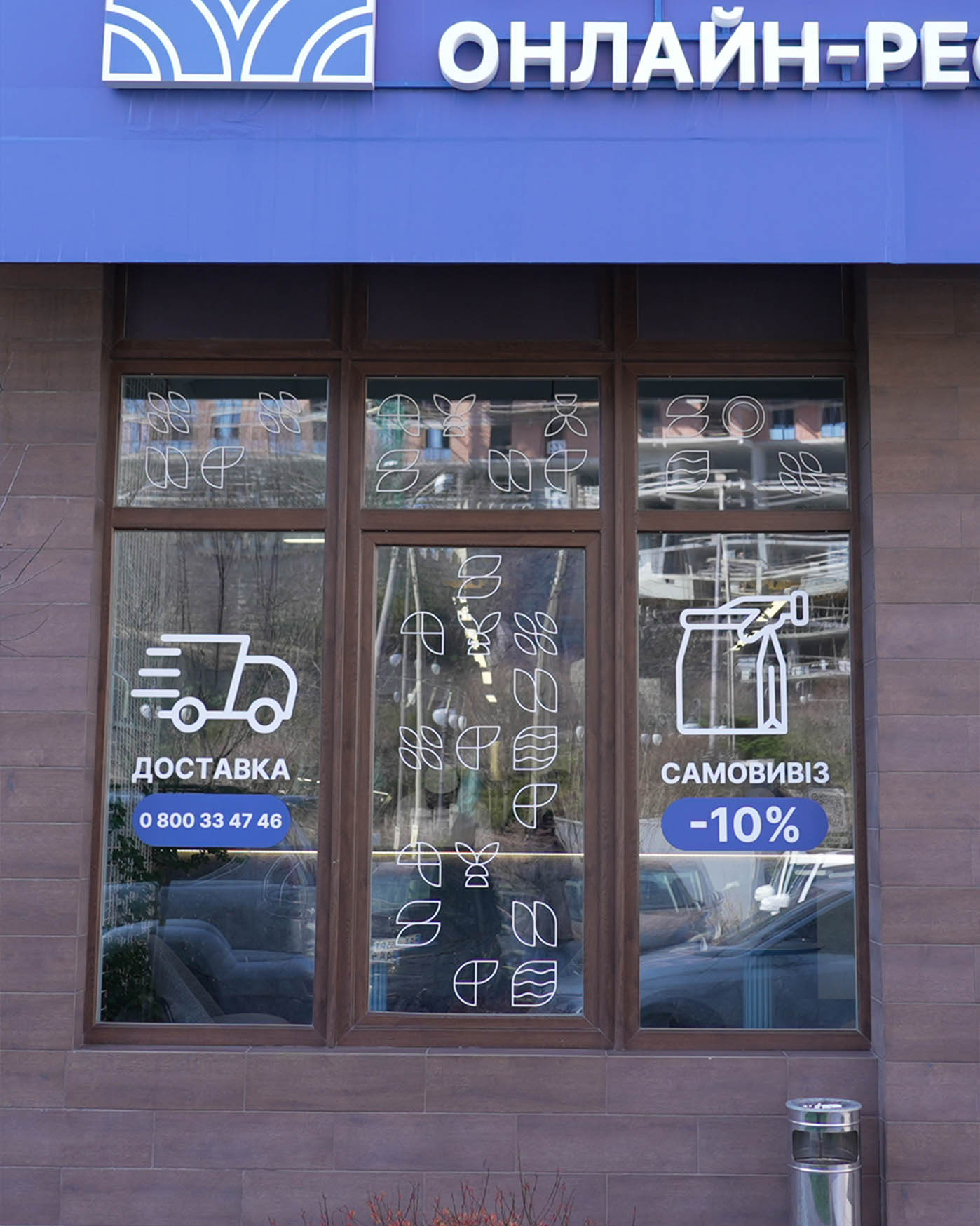 Here we were working with a calmer, more functional location. Straightforward storefront windows, delivery and pickup icons, a clean facade without visual noise. These are the kinds of places where seasonal changes become especially noticeable.
