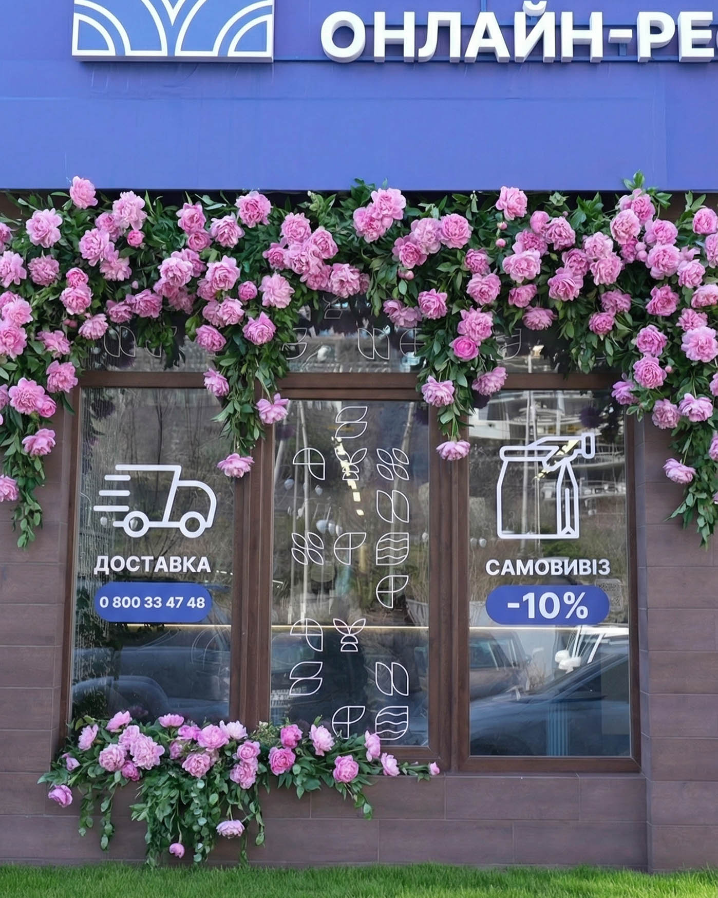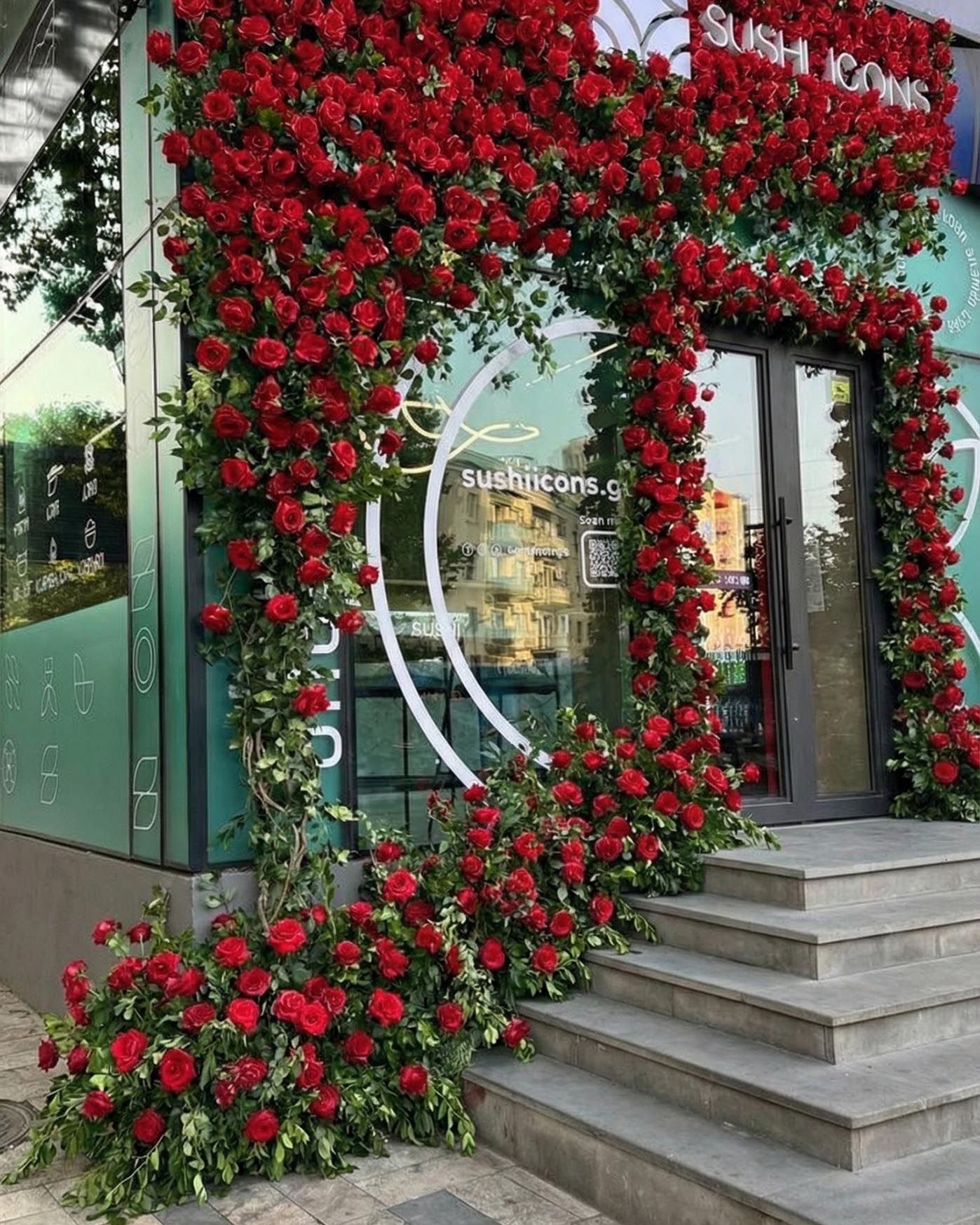 In the final version, the entrance became a rich floral portal that frames the movement from street to door. Deep red roses add depth, set rhythm, and sharply contrast with the calm facade graphics, making the location visible from afar.