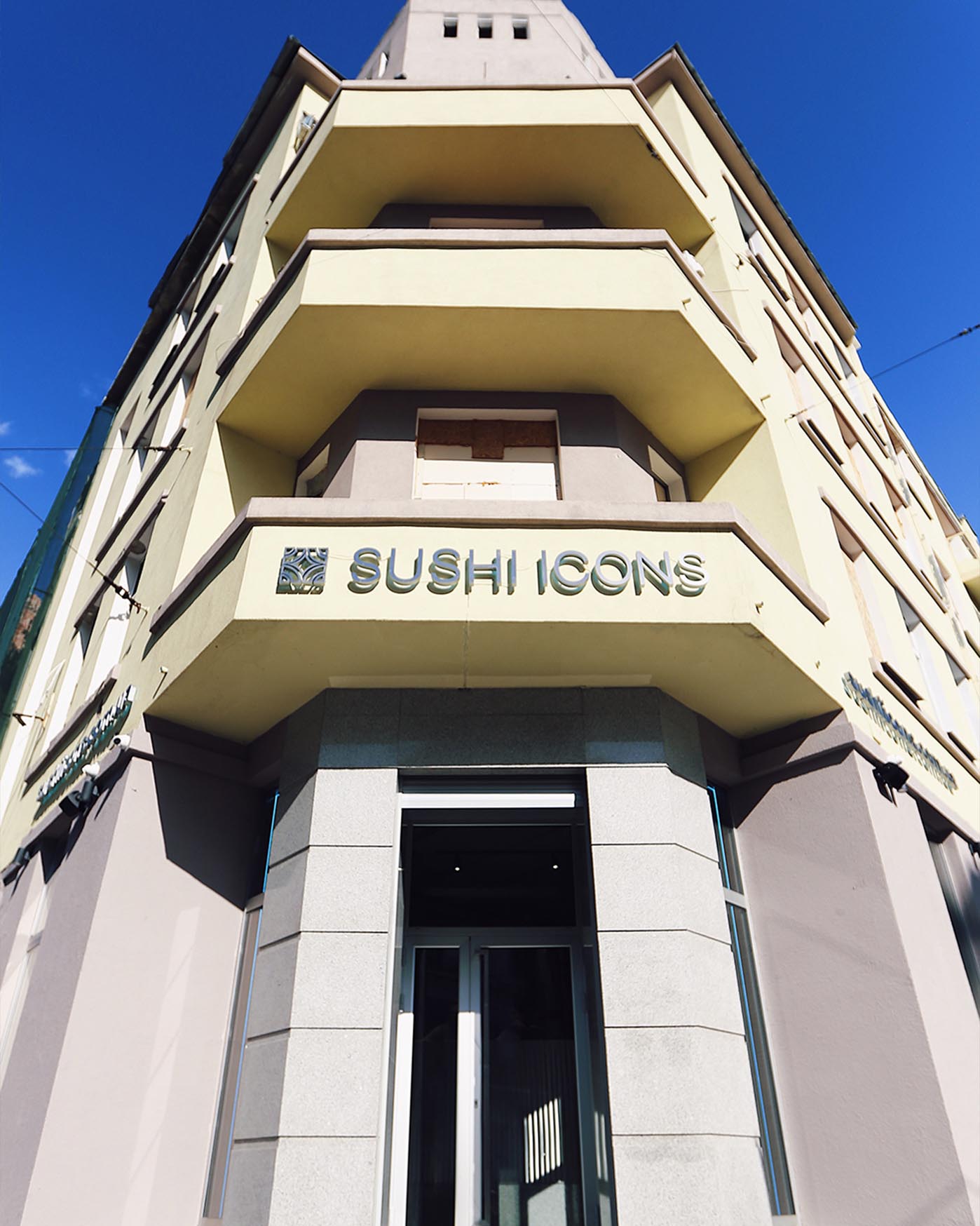 Ця локація одразу задала інший настрій. Високий кутовий будинок, активна геометрія балконів, яскраве небо над головою і велика вивіска Sushi Icons, що працює як центр композиції. Тут нам було важливо не просто додати весняний шар, а вибудувати вертикальний сценарій, який читається знизу догори і підсилює масштаб будівлі.