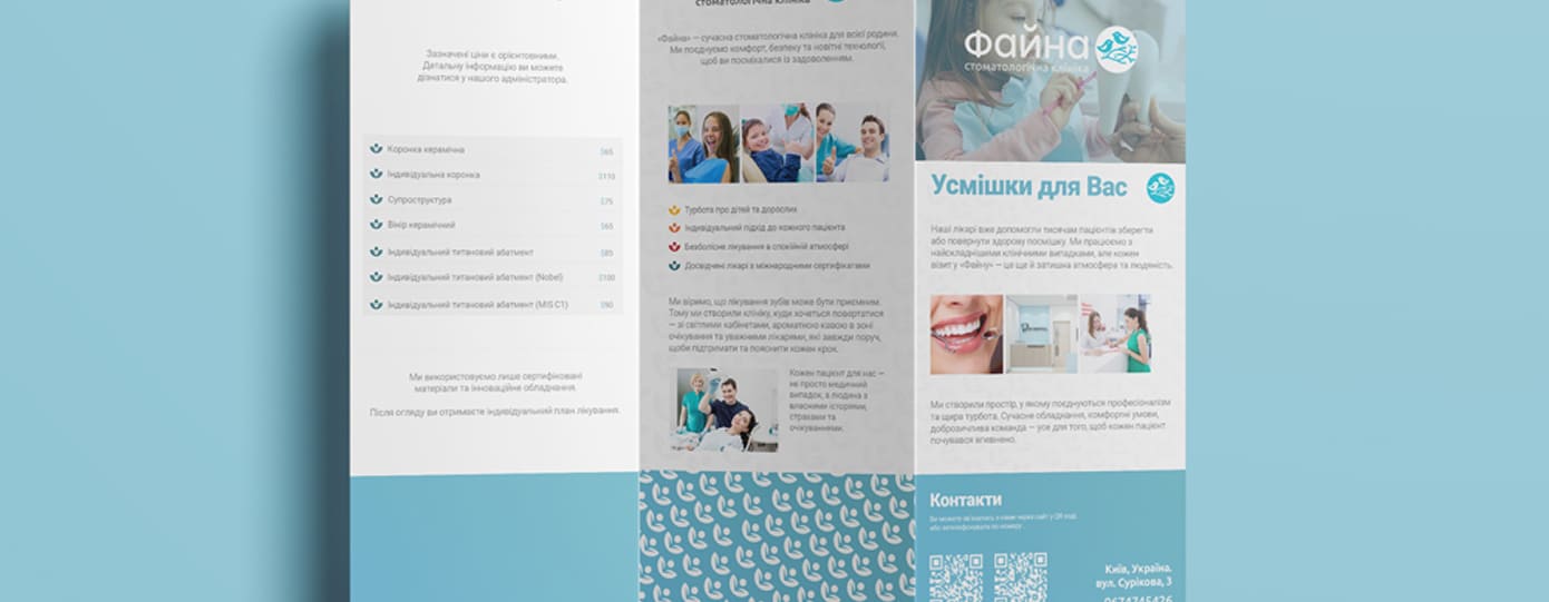 Брошура — функціональна, але при цьому візуально легка. У ній чітко структуровано перелік послуг, розділи з фото, відгуками, карткою клініки. Патерн використовується як декоративна рамка, що робить матеріал естетичним і приємним на дотик.